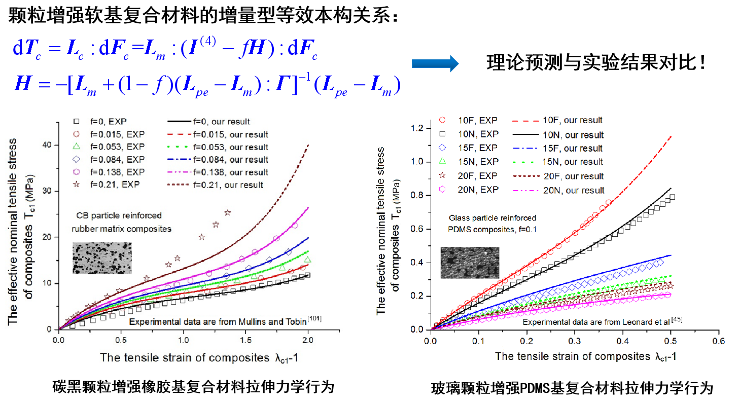 图2 颗粒增强柔性基复合材料的大变形本构模型及理论预测结果