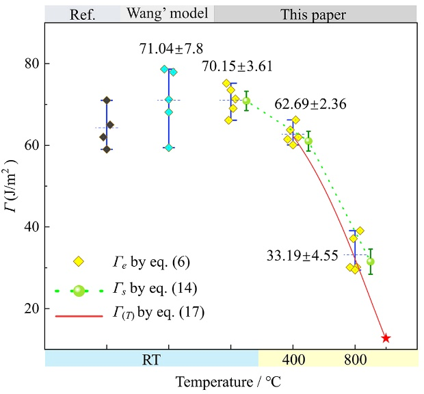 图2不同温度下热障涂层的界面韧性。红线表示界面韧性随温度变化的预测模型。
