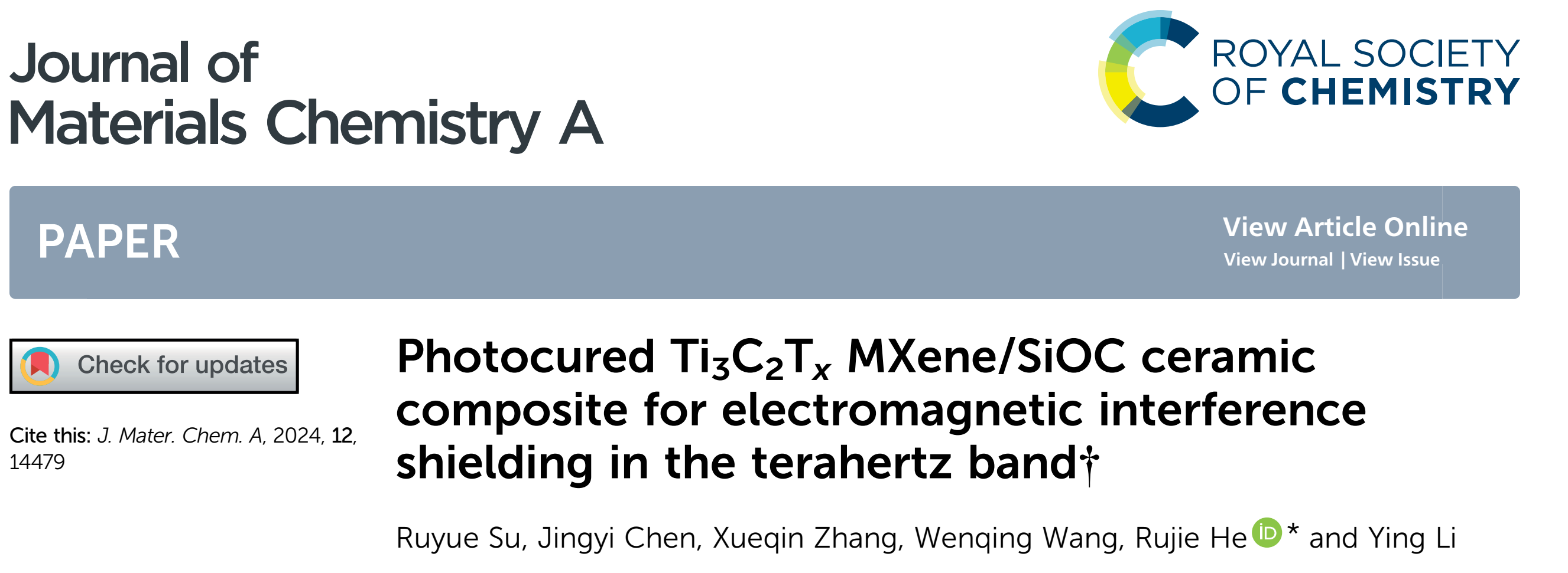 接下来,为了优化PDC-SiOC陶瓷的太赫兹屏蔽性能,团队优化合成了可光固化的Ti3C2Tx MXene/SiOC(MSiOC)陶瓷复合材料。采用丙烯酸改性的环氧硅树脂为前驱体,加入经酸刻蚀获得的MXene粉体,经405 nm波长紫外光固化、真空裂解后得到了MSiOC陶瓷复合材料。MSiOC陶瓷复合材料内部由异质材料交错组成的“三明治”结构,有利于对电磁波的衰减,从而呈现优异的电磁屏蔽性能。相关研究成果以“Photocured Ti3C2Tx MXene/SiOC ceramic composite for electromagnetic interference shielding in the terahertz band”为题发表于材料领域顶级期刊、英国皇家化学会期刊《Journal of Materials Chemistry A》(IF=10.7,http://doi.org/ 10.1039/d4ta02495h),并入选为hot article。