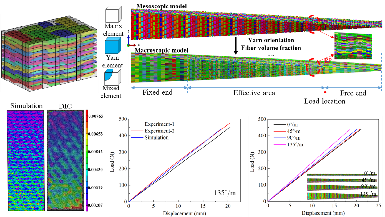 近期,我院梁军教授、葛敬冉副教授课题组基于数字单元法和仿射变换提出了一种能够真实反映机织复合材料扭曲结构内部细观纱线形态的高效数字化建模方法,并基于细观尺度模型预测了复合材料扭曲结构在悬臂载荷下的力学响应。该研究成果以“Mesoscale modeling of woven composite twisted structures combining digital element embedded model and affine transform”为题发表于期刊《Composites Science and Technology》。