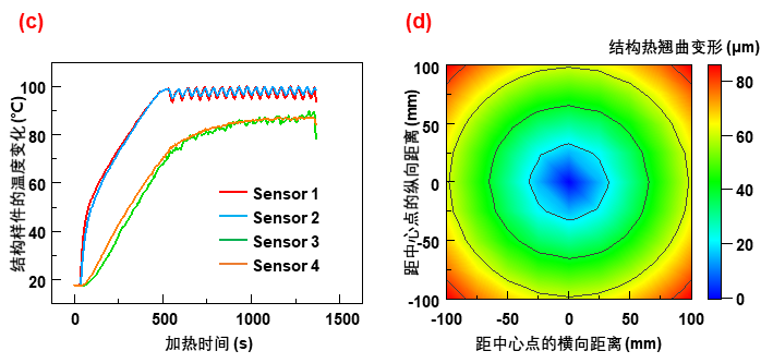 图 2 近零热翘曲超结构样件在复杂多物理场与非均匀温度场下的热变形测试表征。(a)非接触式光学热变形测试平台;(b)超结构样件的测试照片;(c)结构实测温度变化;(d)结构热变形测试结果。