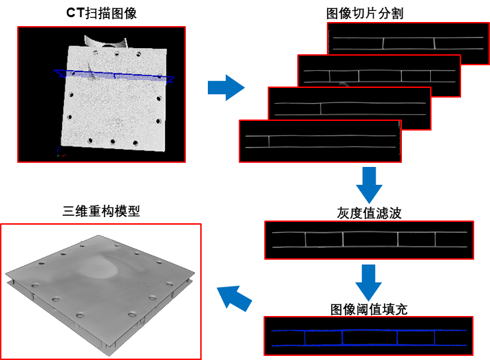 图 3 从CT扫描图像到含有制造缺陷真实分布特征的的三维高保真重构模型的流程图。
