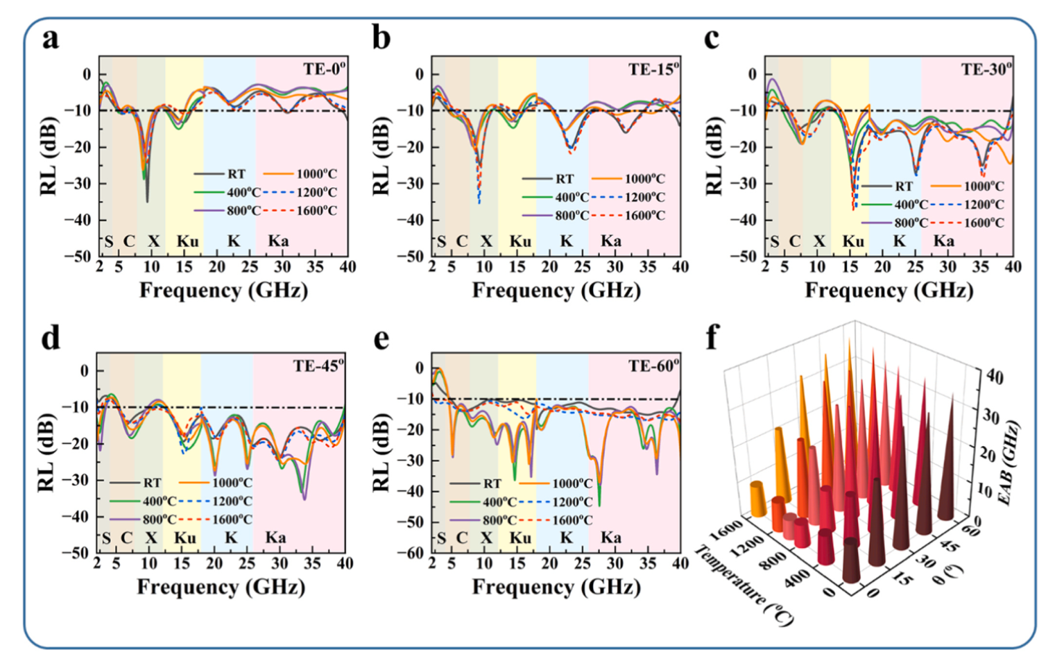 研究首先测试了挤出3D打印制备的SiC陶瓷材料的电性能参数,建立了大变异遗传算法框架,设计了基于陶瓷增材的SiC陶瓷材料梯度蜂窝超结构。进而采用团队近年来攻关发展的大尺寸陶瓷挤出3D打印技术,实现了大尺寸SiC陶瓷材料梯度蜂窝超结构的制造。设计制造的SiC陶瓷材料梯度蜂窝超结构,室温环境下,在4.85-39.49GHz的超宽频段内具有-10dB以下的隐身效果。即使在温度超过1600℃的服役环境下,有效吸波带宽仍然超过35GHz。且该SiC陶瓷材料梯度蜂窝超结构在不同入射角度、不同极化模式下都具有优异的宽频吸波性能。
